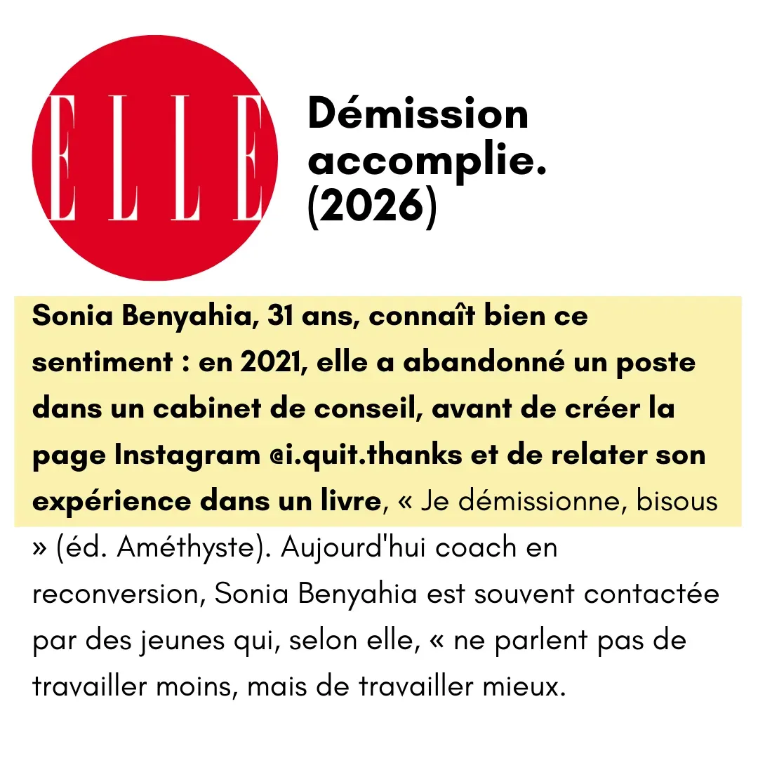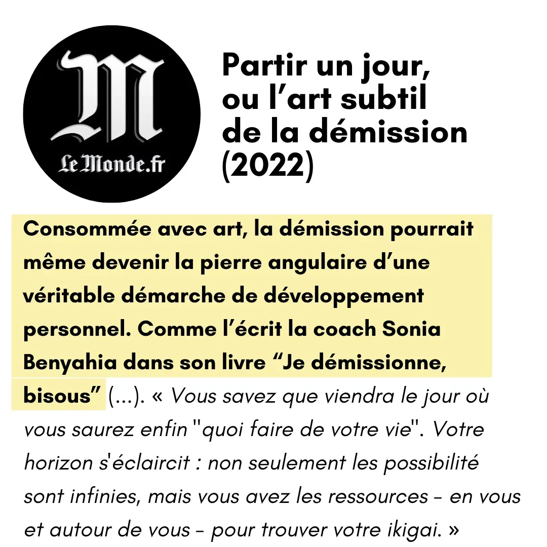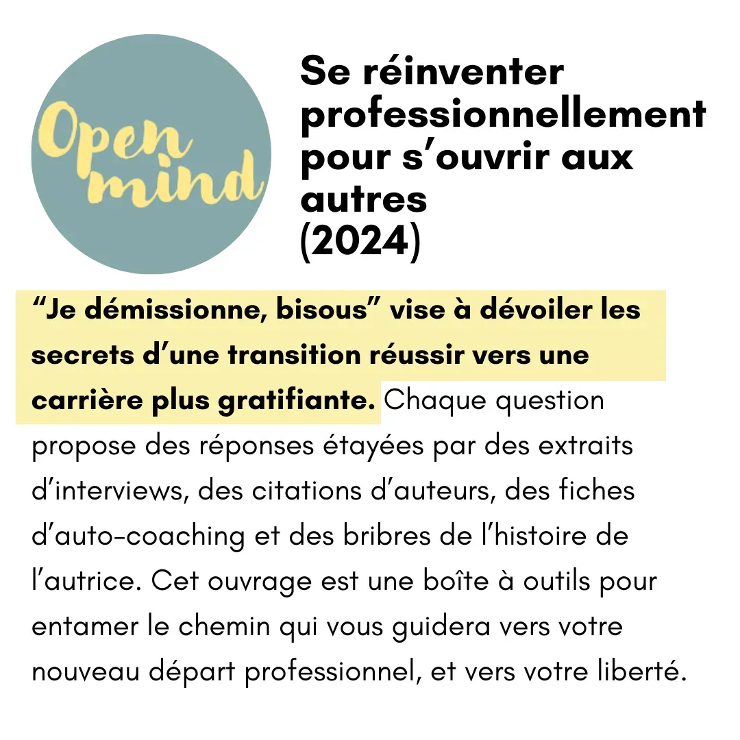Alors je lance une enquête de 2 ans, auprès de 120 reconvertis. Je veux m'inspirer de leurs parcours pour trouver ma juste place. Et ça marche. Je quitte le conseil pour écrire mon livre "Je démissionne bisous".